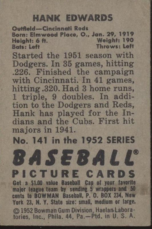 Hank Edwards 1952 Bowman #141 Cincinnati Reds VG-EX
