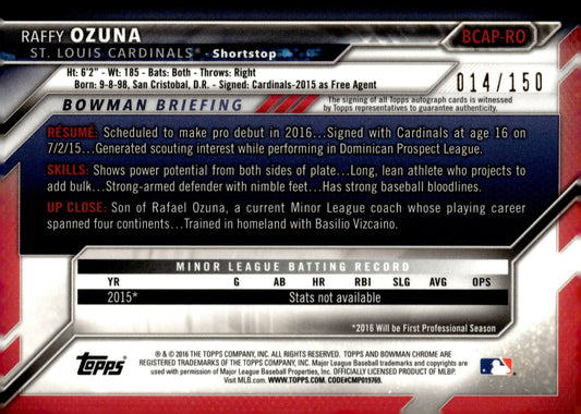 Raffy Ozuna 2016 Bowman Chrome Blue Refractor Auto 014/150 #BCAP-RO