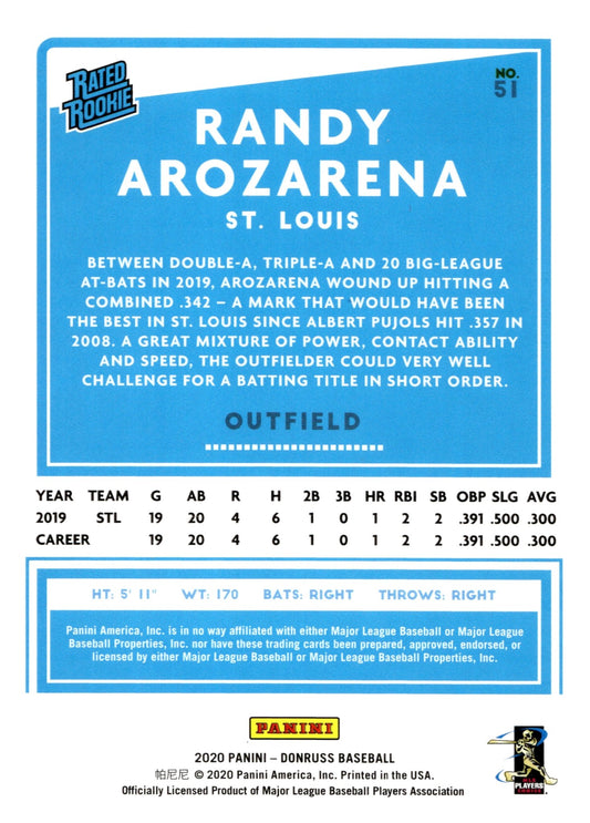 Randy Arozarena 2020 Panini Donruss Rated Rookie RC #51