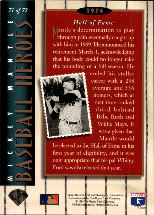 Mickey Mantle 1994 Upper Deck Mantle Heroes 1974 Hall of Fame #71