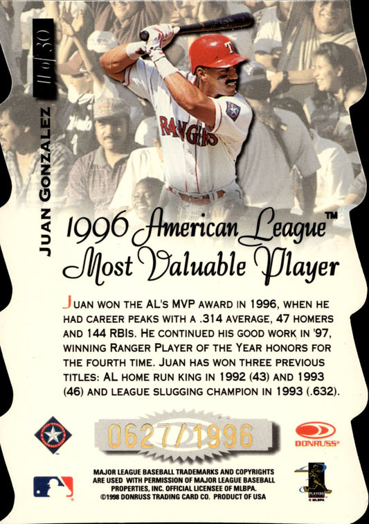 Juan Gonzalez 1999 Donruss Preferred Titles Waves Die-Cut 0627/1996 #11