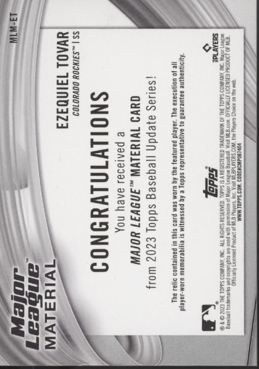 Ezequiel Tovar 2023 Topps Update Series Major League Material Swatch RC #MLM-ET