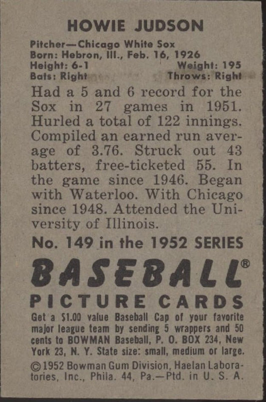 Howie Judson 1952 Bowman #149 Chicago White Sox VG-EX
