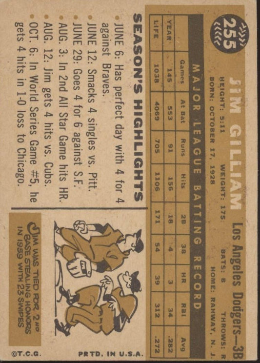Jim Gilliam 1960 Topps #255 Los Angeles Dodgers VG #1