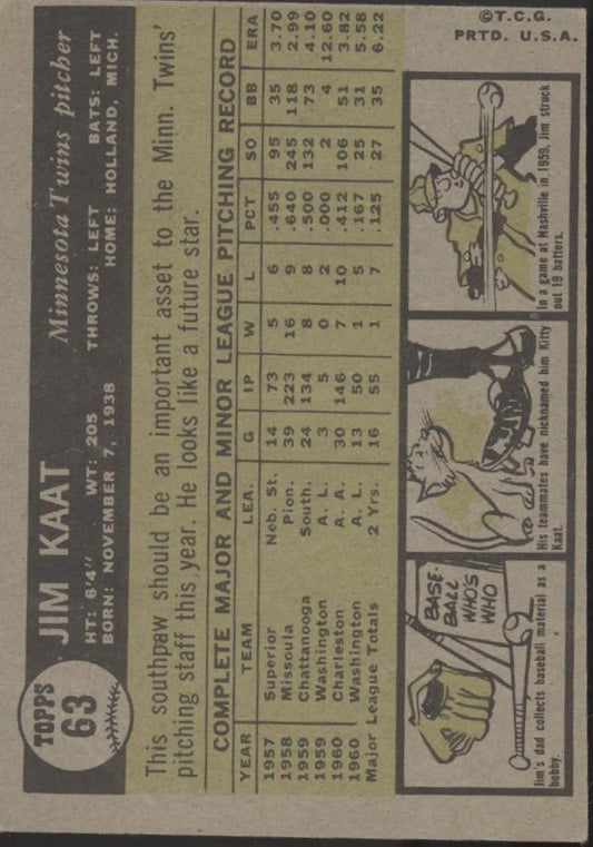 Jim Kaat 1961 Topps #63 Minnesota Twins VG