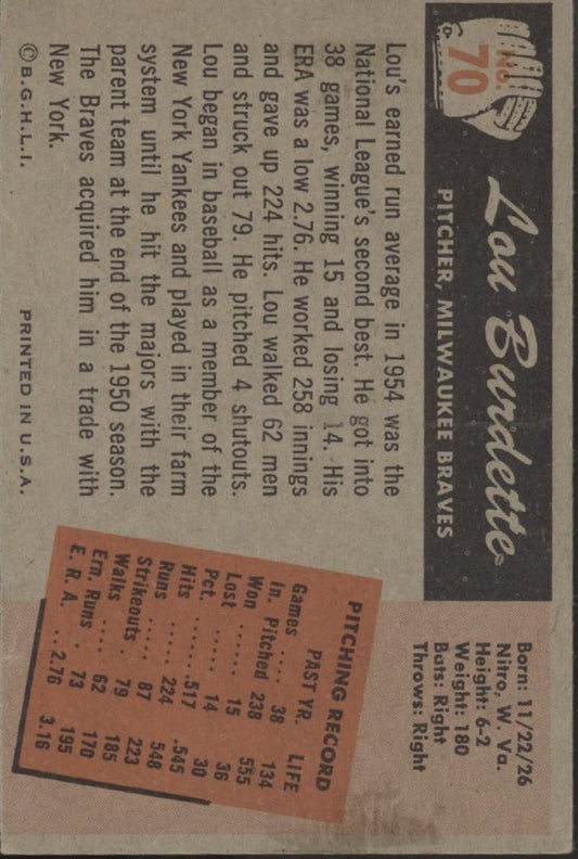Lou Burdette 1955 Bowman #70 Milwaukee Braves VG-EX