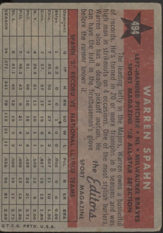 Warren Spahn 1958 Topps #494 Milwaukee Braves PR
