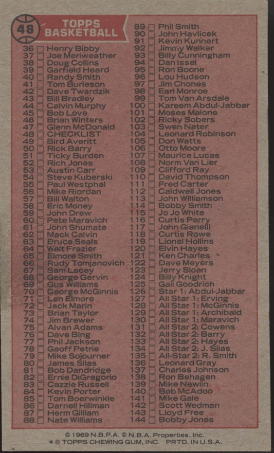 Checklist 1976-77 Topps Basketball (1-144) #48 Marked