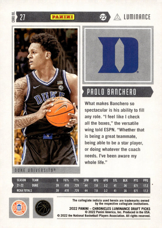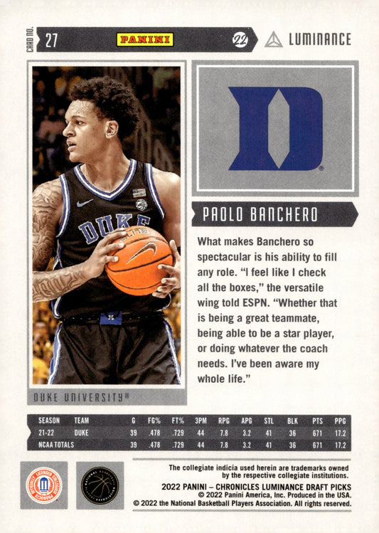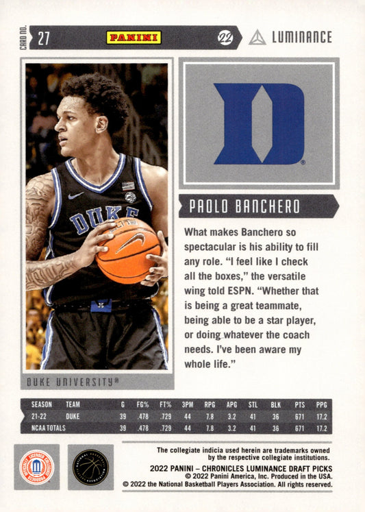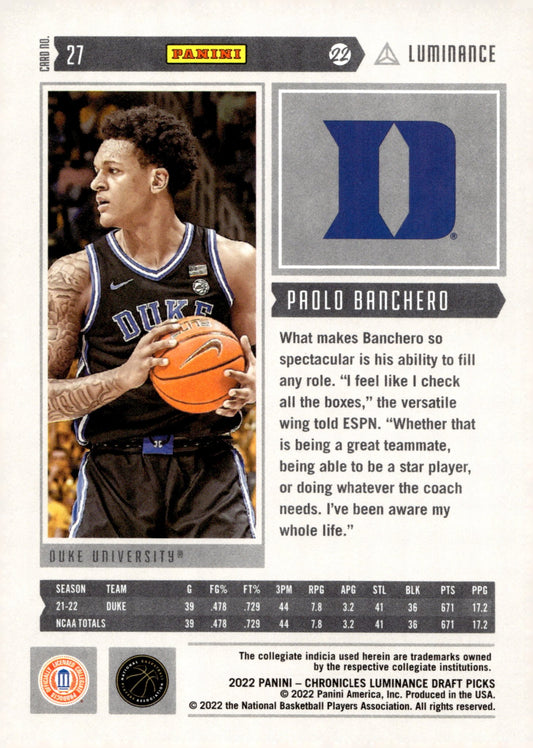 Paolo Banchero 2022 Panini Chronicles Luminance Draft Picks RC #27 #4