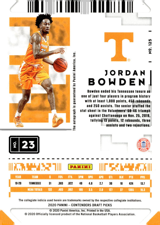 Jordan Bowden 2020 Panini Contenders Draft Picks Game Ticket Red RC Auto #125