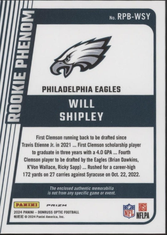 Will Shipley 2024 Panini Donruss Optic Rookie Phenom Blue Prizm Swatch RC
