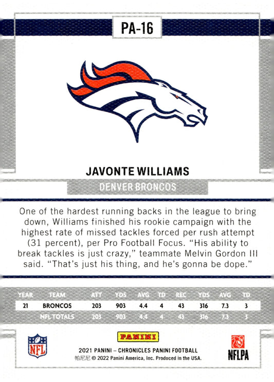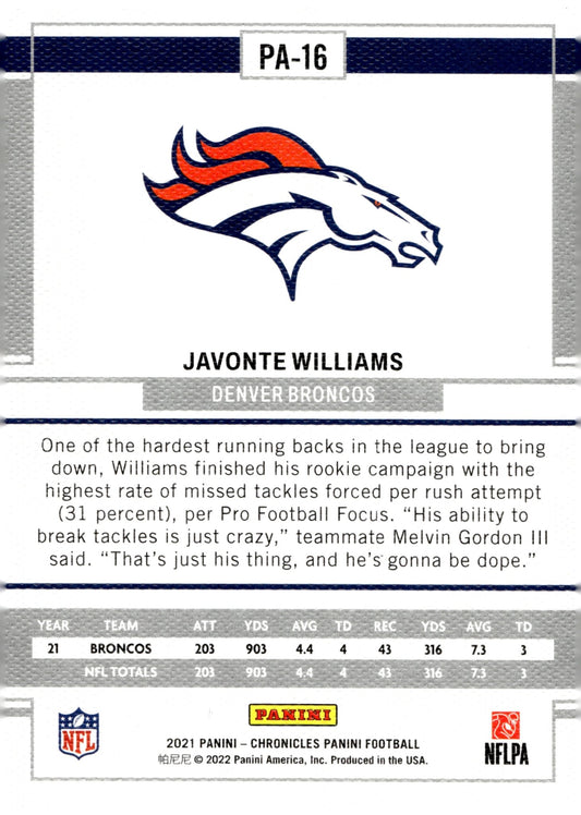 Javonte Williams 2021 Panini Chronicles Panini RC #PA-16 #1