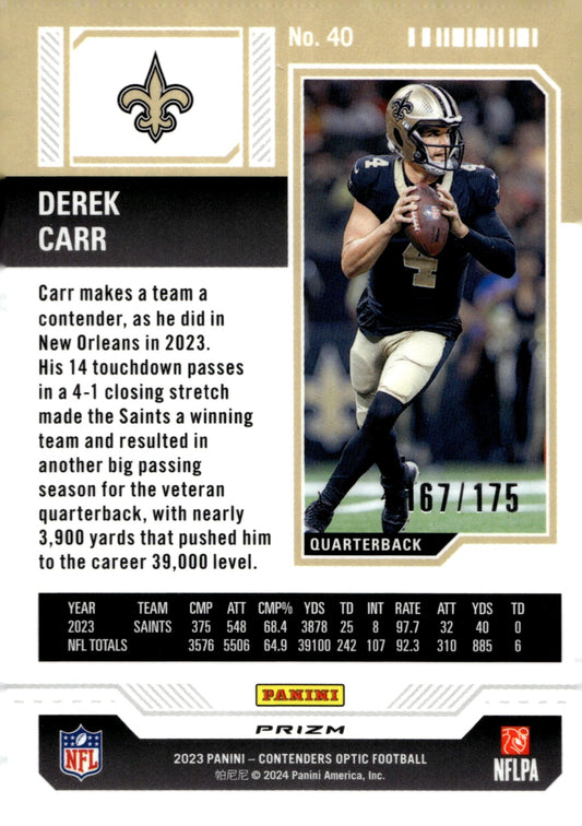 Derek Carr 2023 Panini Contenders Optic Season Ticket Red Prizm 167/175 #40