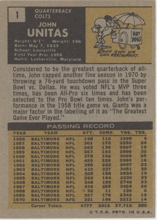 John Unitas 1971 Topps #1 Baltimore Colts VG-EX