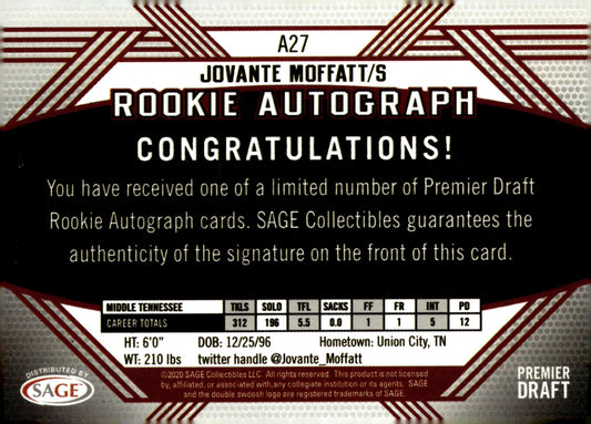 Jovante Moffatt 2020 Sage Hit Premier Draft RC Auto #A27