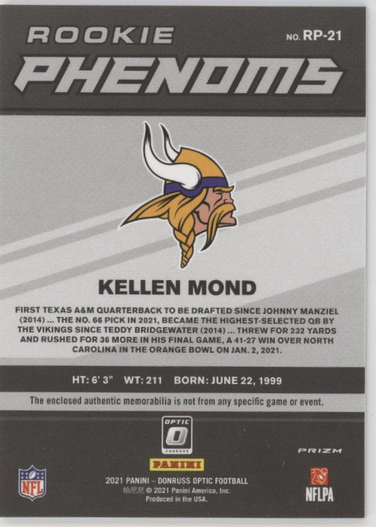 Kellen Mond 2021 Panini Donruss Optic Rookie Phenoms Red Prizm Swatch RC #RP-21