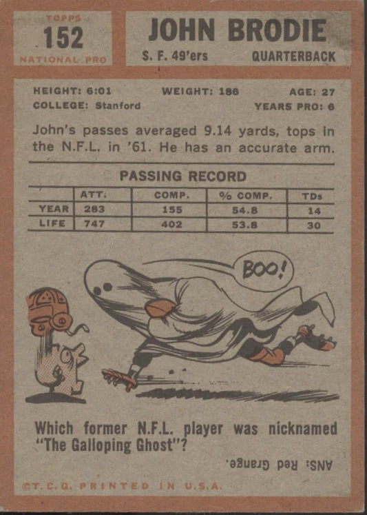 John Brodie 1962 Topps #152 San Francisco 49ers VG #1