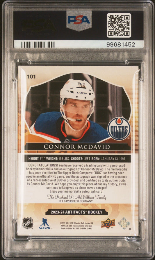 Connor McDavid 2023-24 UD Artifacts Gold Dual Swatch Auto 25/25 #101 PSA 9 / 9