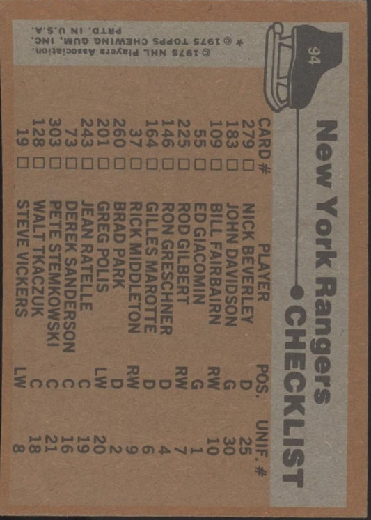 New York Rangers 1975-76 Topps Checklist #94 EX