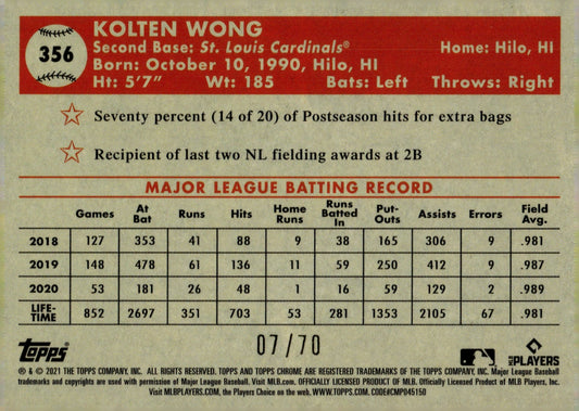 Kolten Wong 2021 Topps Chrome Platinum Logo Mini Diamond Refractor 07/70 #356