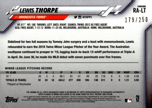 Lewis Thorpe 2020 Topps Chrome Purple Refractor RC Auto 179/250 #RA-LT
