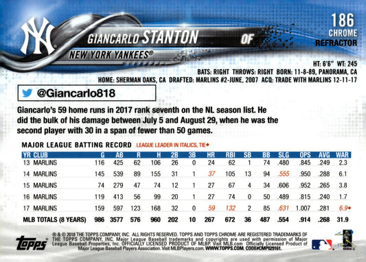 Giancarlos Stanton 2018 Topps Chrome Pink Refractor #186