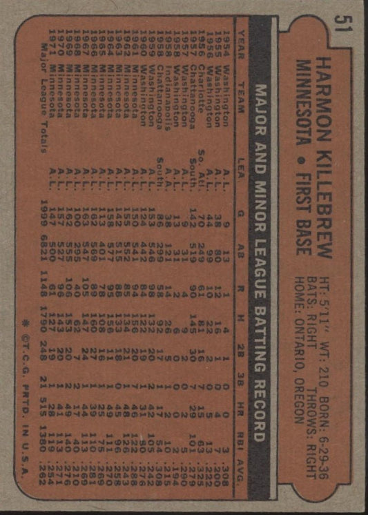 Harmon Killebrew 1972 Topps #51 Minnesota Twins VG #1