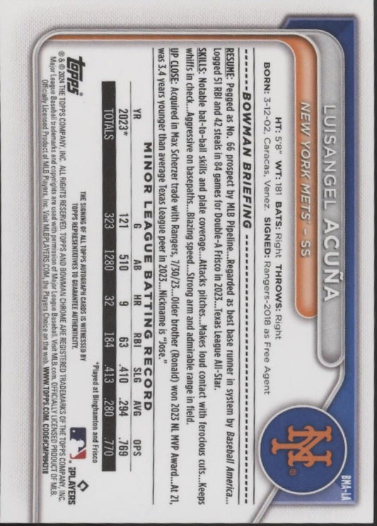 Luisangel Acuna 2024 Bowman Chrome Yellow Mojo Refractor Auto 33/75 #BMA-LA