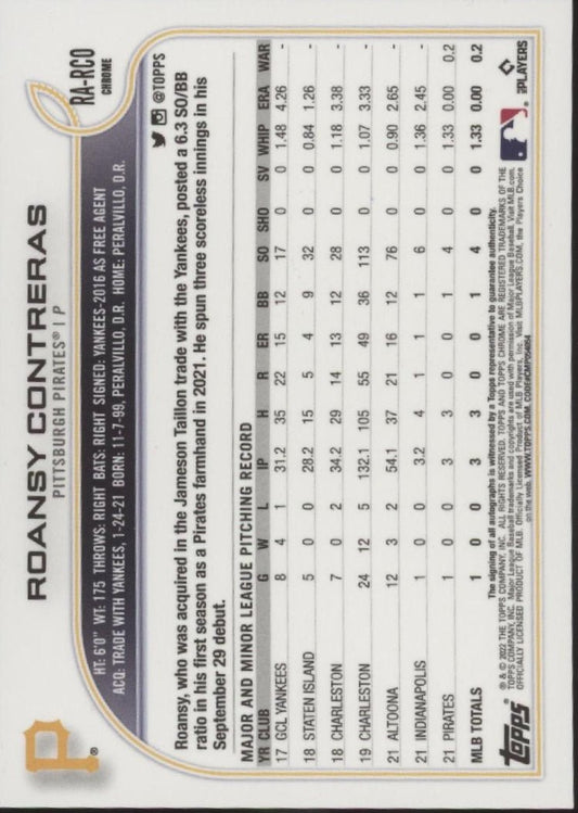 Roansy Contreras 2022 Topps Chrome RC Auto #RA-RCO