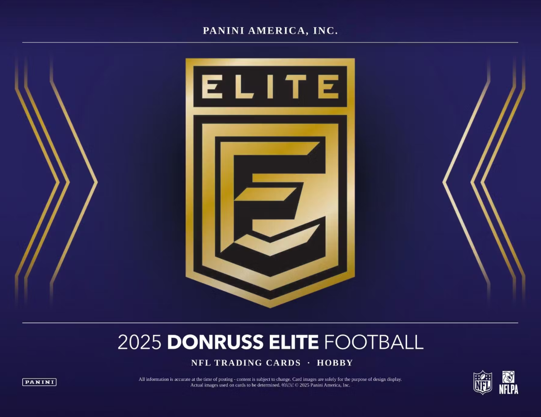 The fabled Donruss Elite Football franchise returns for the 2025 NFL season locked and loaded with a 200-card base set, featuring a captivating base aesthetic and 100 Rookie Cards!
