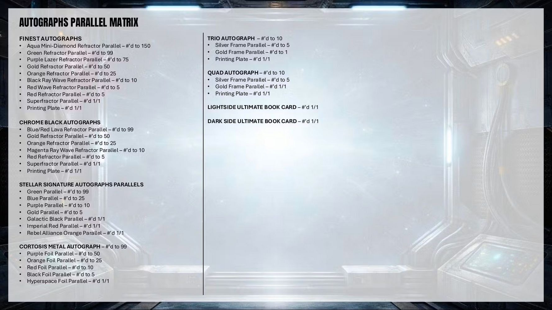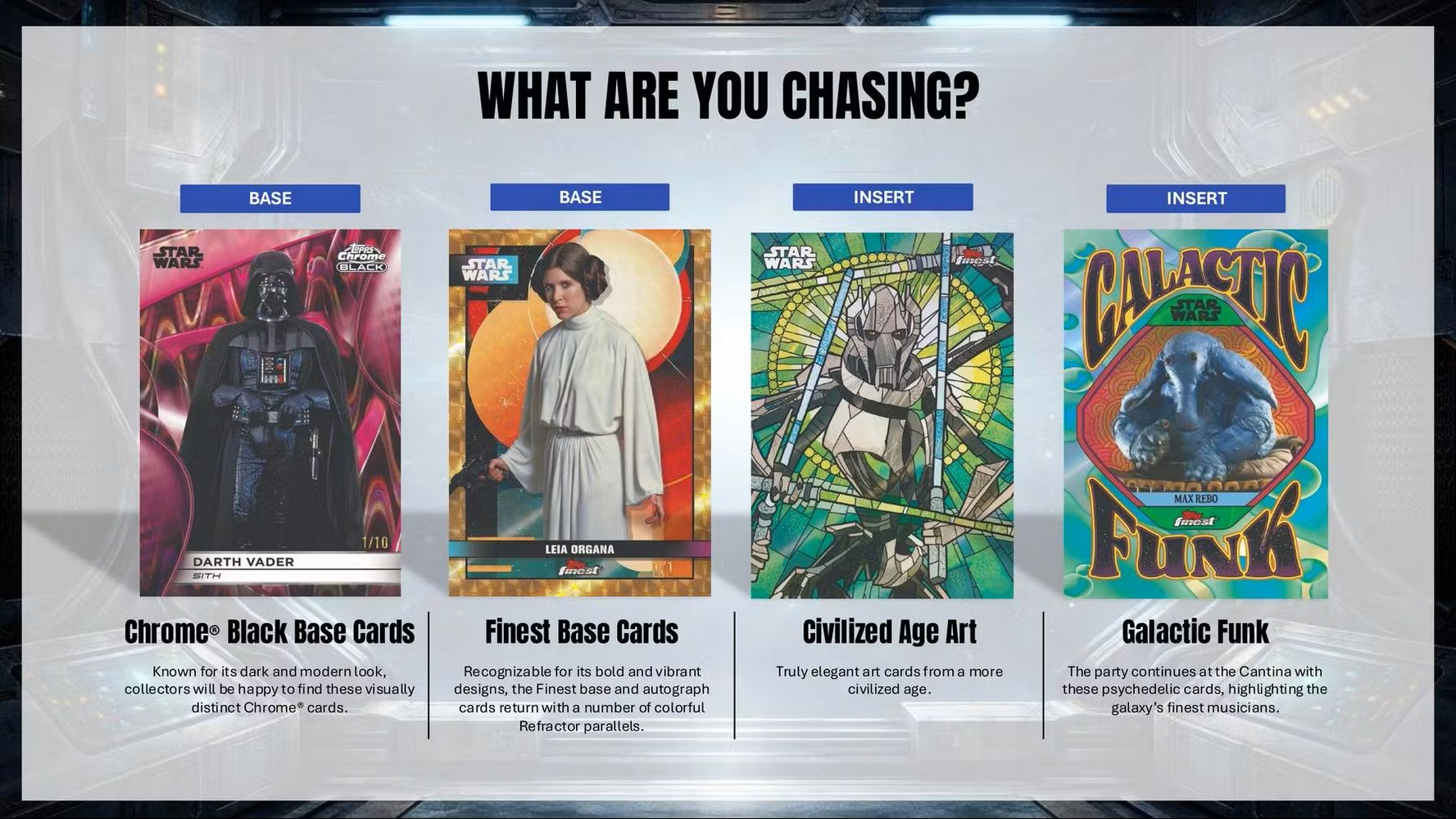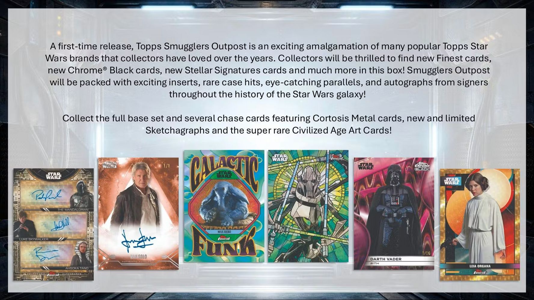 A first-time release, Topps Smugglers Outpost is an exciting amalgamation of many popular Topps Star Wars brands that collectors have loved over the years. Collectors will be thrilled to find new Finest cards, new Chrome Black cards, new Stellar Signatures cards and much more in this box! Smugglers Outpost will be packed with exciting inserts, rare case hits, eye-catching parallels, and autographs from signers throughout the history of the Star Wars galaxy!