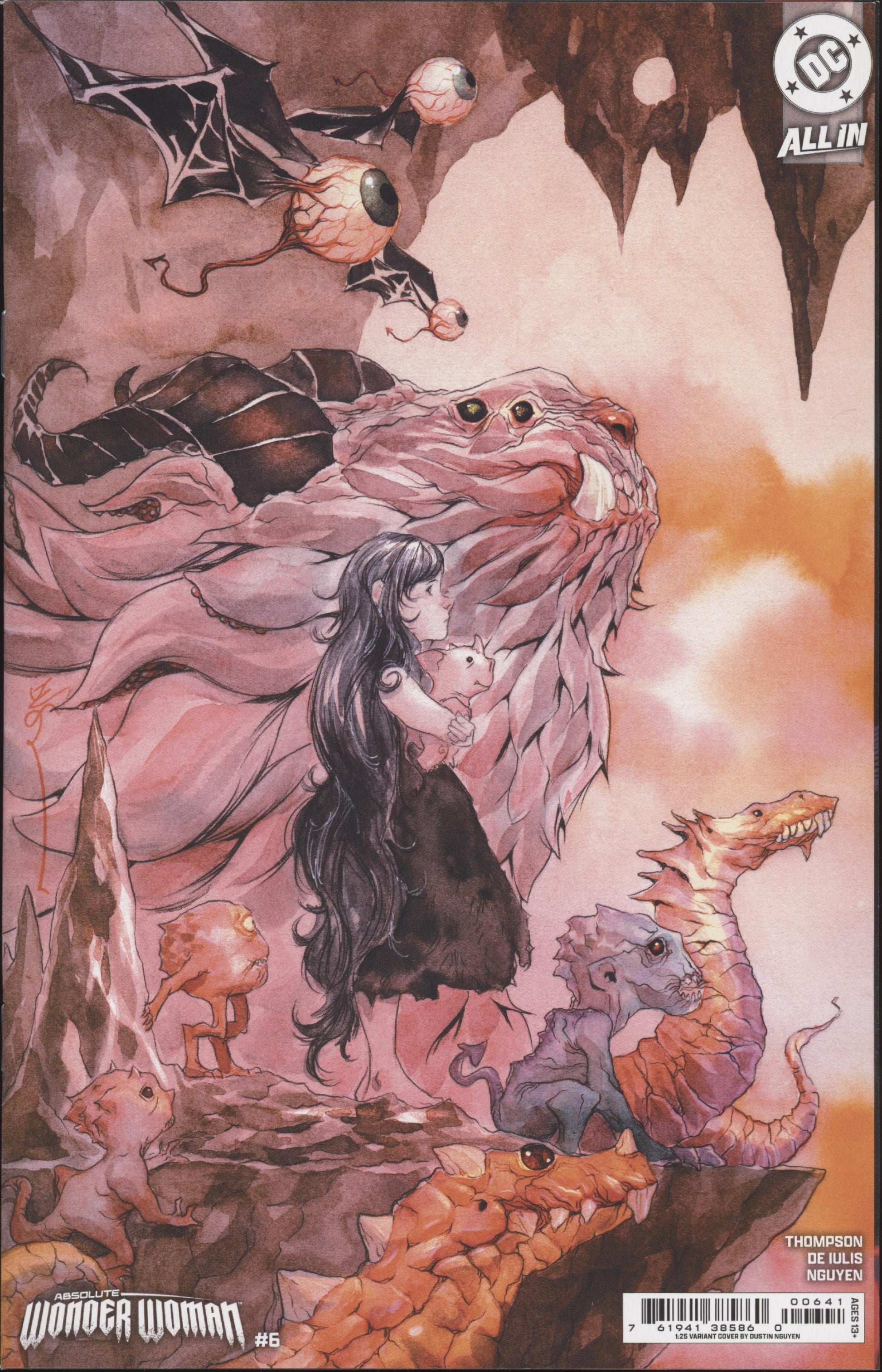 Limited 1 for 25 Retailer Incentive Variant Cover. Written by Kelly Thompson. Art by Mattia De Iulis. Cover by Dustin Nguyen. THE SHOCKING ORIGIN OF DIANA'S DEADLY WEAPONS! Diana defied the will of the gods in leaving Hell, and Hades, lord of the underworld, takes that personally...but when he interrogates her, her tales surprise him. Will it change her fate? Kicking off a two-part guest arc from the breakout artist of The Cull, Mattia De Iulis--and featuring a surprising and delightful backup tale of Li'l Diana by series writer Kelly Thompson and superstar artist Dustin Nguyen! 32 pages, full color. Rated T+