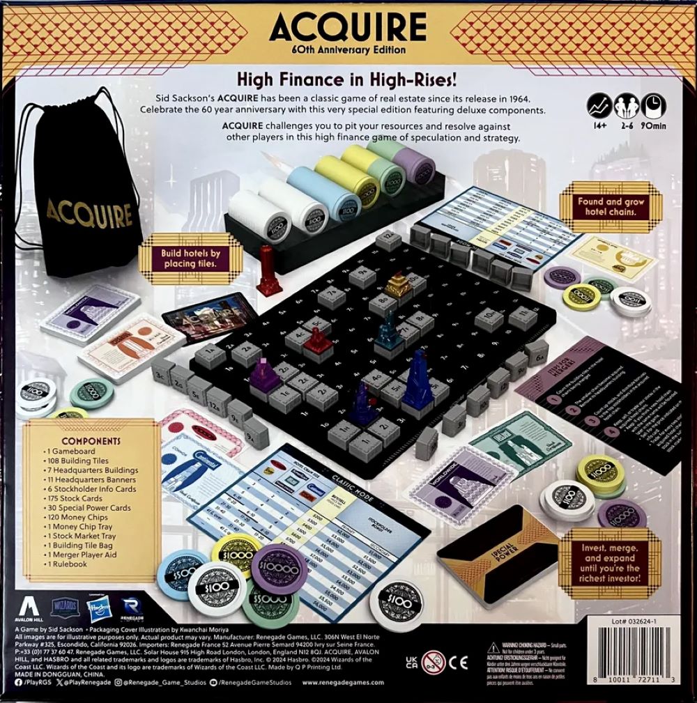 Sid Sackson’s ACQUIRE has been a classic game of real estate since its release in 1964. Celebrate the 60 year anniversary with this very special edition featuring deluxe components.