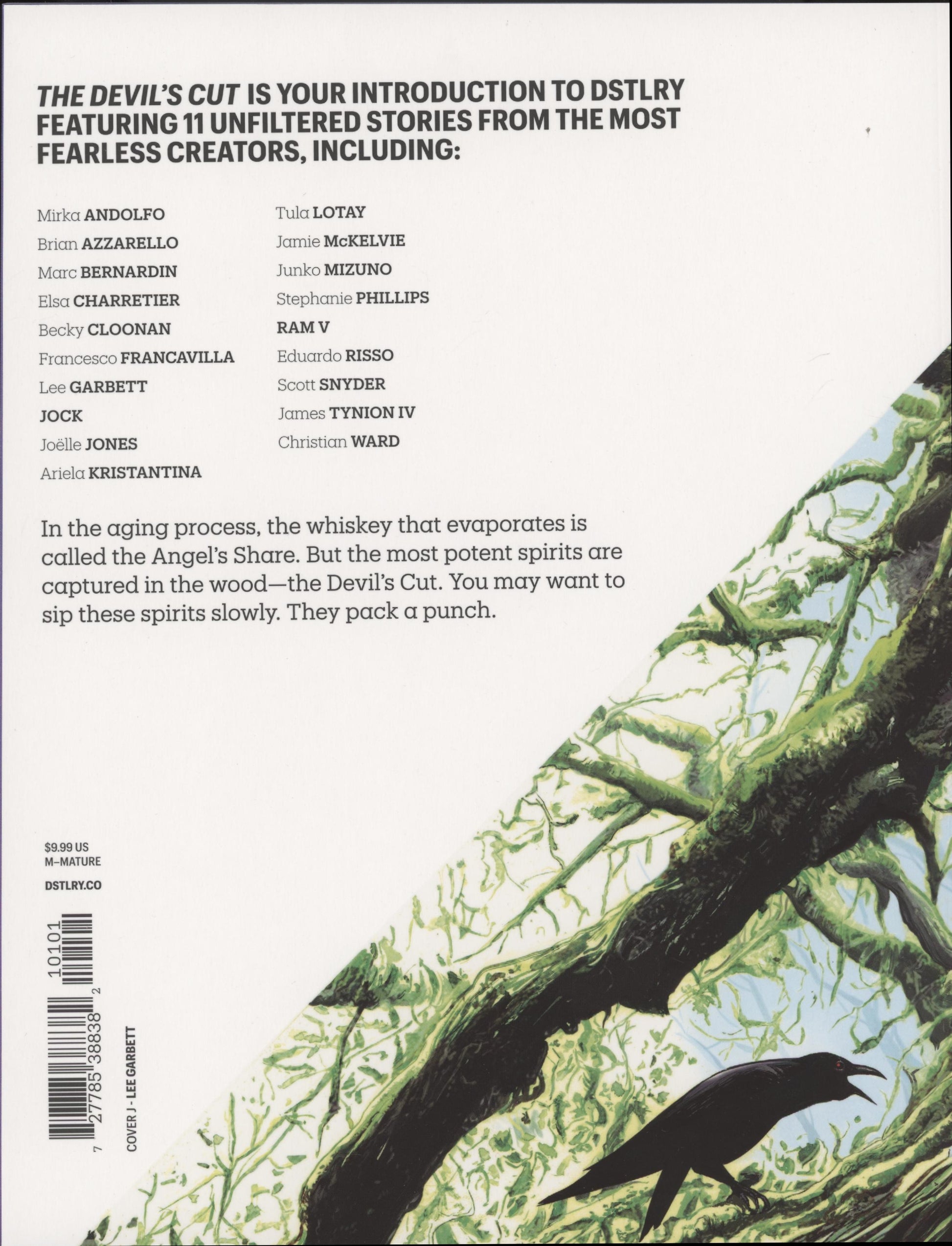 Limited 1 for 25 Retailer Incentive Variant Cover. Written by Mirka Andolfo & Various. Art by Elsa Charretier & Various. The Devil's Cut is your introduction to DSTLRY, a new publisher redefining creator-owned comics. In the aging process, the whiskey that evaporates is called the Angel's Share. But the most potent spirits are captured in the wood-the Devil's Cut. This is The Devil's Cut-unfiltered stories from the most fearless creators, offering a distinct taste of the quality to come. 72 oversized pages printed on premium paper, featuring a flight of high-proof work from our Founding Creators including Scott Snyder, James Tynion IV, Tula Lotay, Mirka Andolfo, Jock, Becky Cloonan, Brian Azzarello, Marc Bernardin, Elsa Charretier, Lee Garbett, Joelle Jones, Stephanie Phillips, Ram V, Jamie McKelvie, Junko Mizuno and friends including Francesco Francavilla, Ariela Kristantina, Eduardo Risso, Christian Ward, and more. Edited by the legendary Will Dennis. 88 pages, CP/B&W. Rated M
