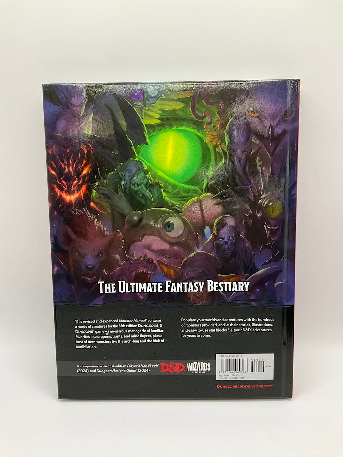 In this new and improved 2024 Monster Manual, meet a monstrous menagerie of creatures for fifth edition! Encounter iconic D&D favorites like dragons and mind flayers, confront a host of new monsters, and take on higher level play with terrifying creatures like the arch-hag and the blob of annihilation. We’ve filled this book with breathtaking creature art of almost every monster, including the legendary D&D dragons, and carefully redesigned each monster stat block to be easier to run and reference. Populate your worlds and adventures with the hundreds of monsters provided, and let their stories, illustrations, and streamlined stat blocks fuel your D&D adventures for years to come.
