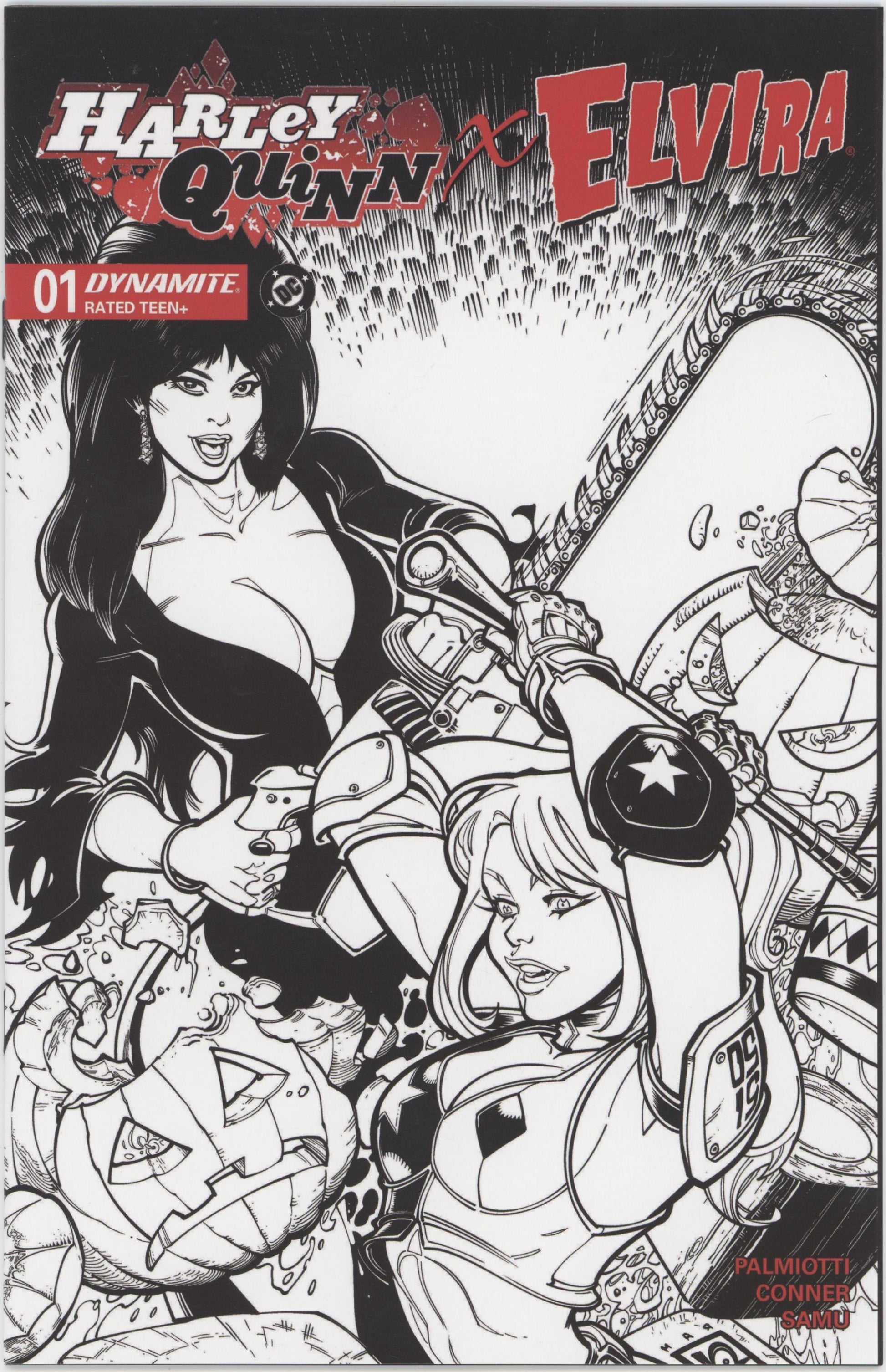 Limited 1 for 10 Retailer Incentive Variant Cover. (W) Amanda Conner, Jimmy Palmiotti (A) Amanda Conner, Juan Samu (CA) Chad Hardin THE MISTRESS OF THE DARK MEETS DADDY'S LITTLE MONSTER! What happens when the Clown Princess of Crime gets bored? Shenanigans, hijinks, grievous bodily harm… the possibilities are endless! Now add in a certain macabre-minded TV host who seems to attract trouble like crypts attract vampires, and the stage is set for the greatest team-up since Frankenstein met his Bride! With her beloved show on the chopping block following a corporate takeover, Elvira needs to come up with a plan to get things back in the black - and her new friend Harley Quinn has an idea that's just crazy enough to work! Together, they're going to throw the greatest Halloween party Brooklyn has ever seen - whether the borough likes it or not! Written by AMANDA CONNER and JIMMY PALMIOTTI - the world-famous tag-team of all things Harley Quinn - this crossover event for the ages from Dynamite and DC Comics also showcases Amanda's fan-favorite artistic chops, with each issue featuring two (count 'em, two) Conner covers. And that's not all (certainly not!) - she's also joining interior artist (and Elvira favorite) JUAN SAMU to provide selected story pages for the series! But wait, there's more! This premier issue also includes darkly captivating covers from JOSEPH MICHAEL LINSNER, CHAD HARDIN, BEN CALDWELL, and best-selling Mark Spears Monsters creator MARK SPEARS! Full Color, 32 pages, Rated Teen.