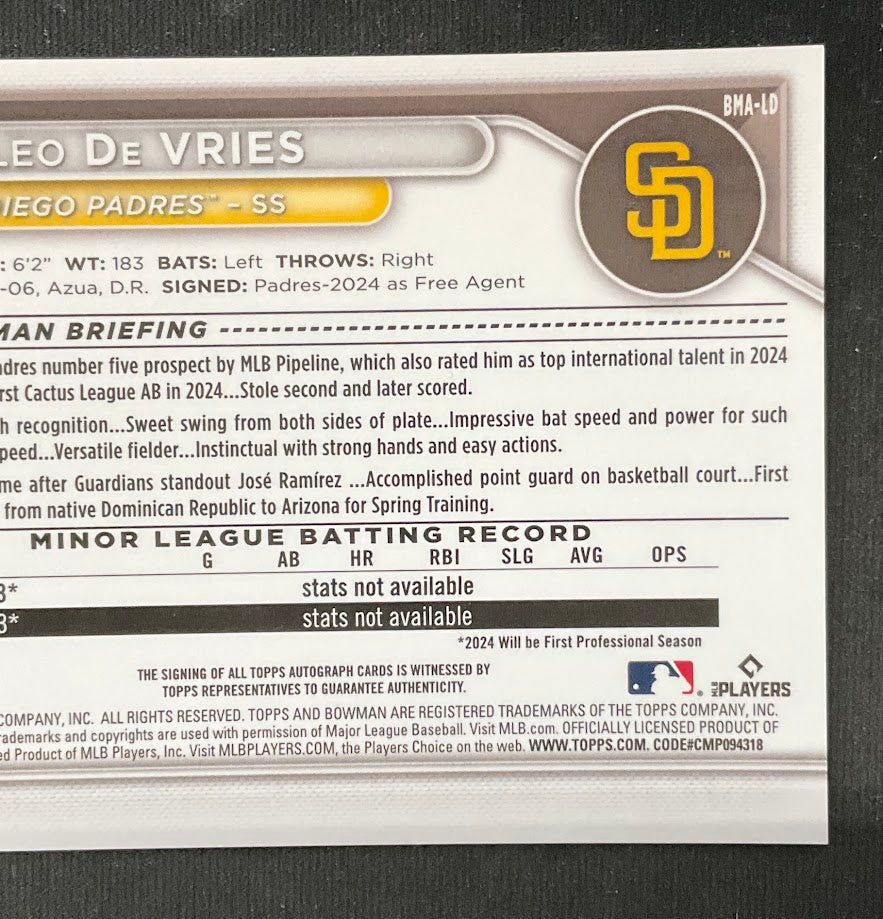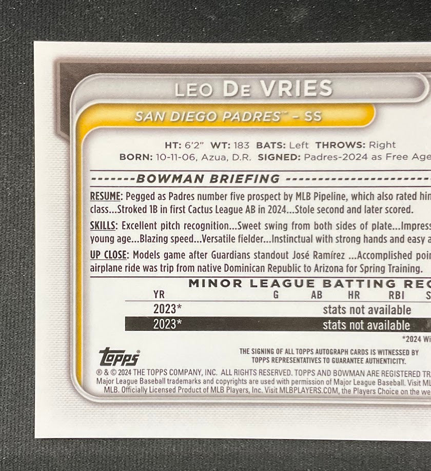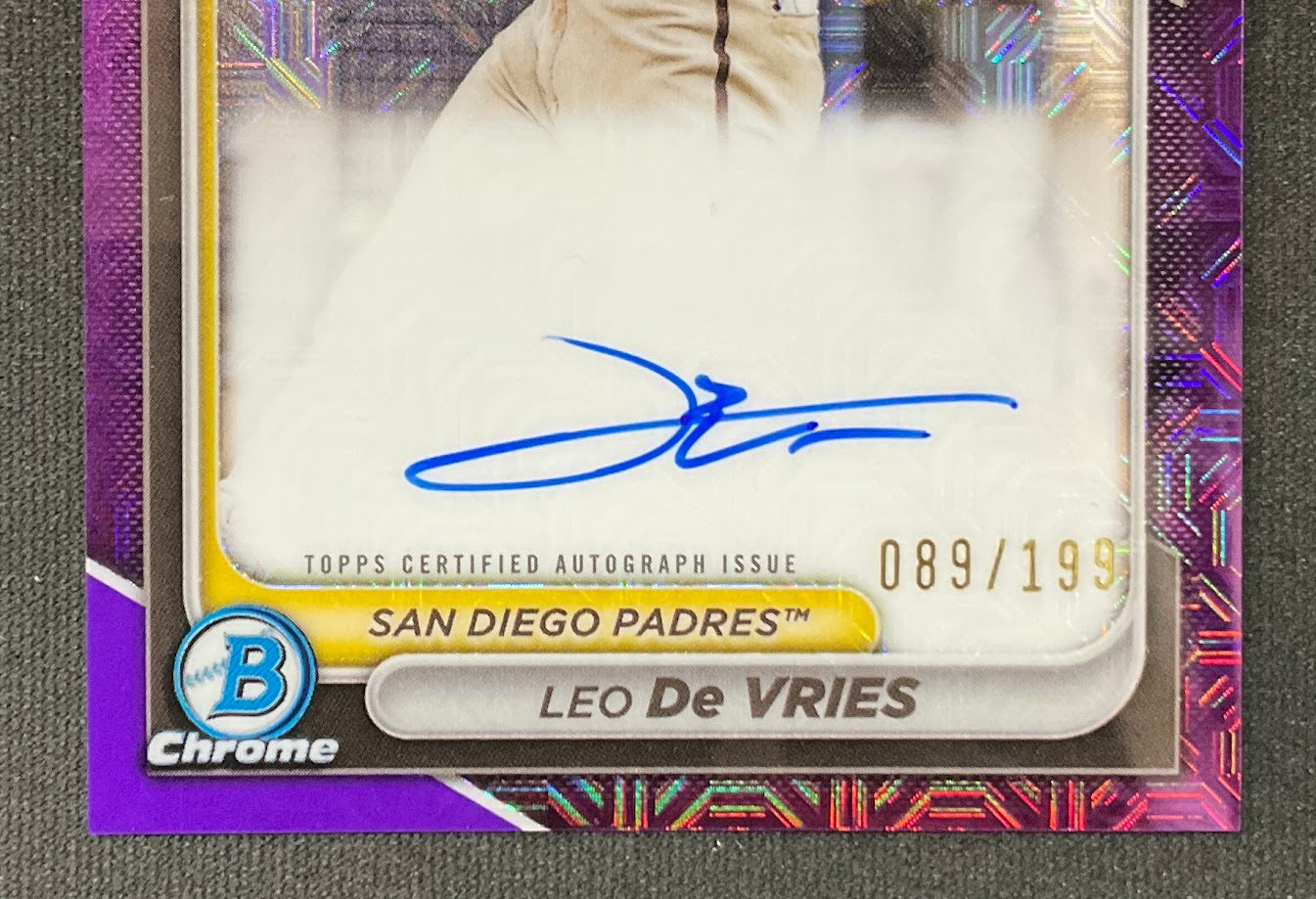 Leo De Vries 2024 Bowman Chrome Purple Mojo Refractor Auto 089/199 #BMA-LD