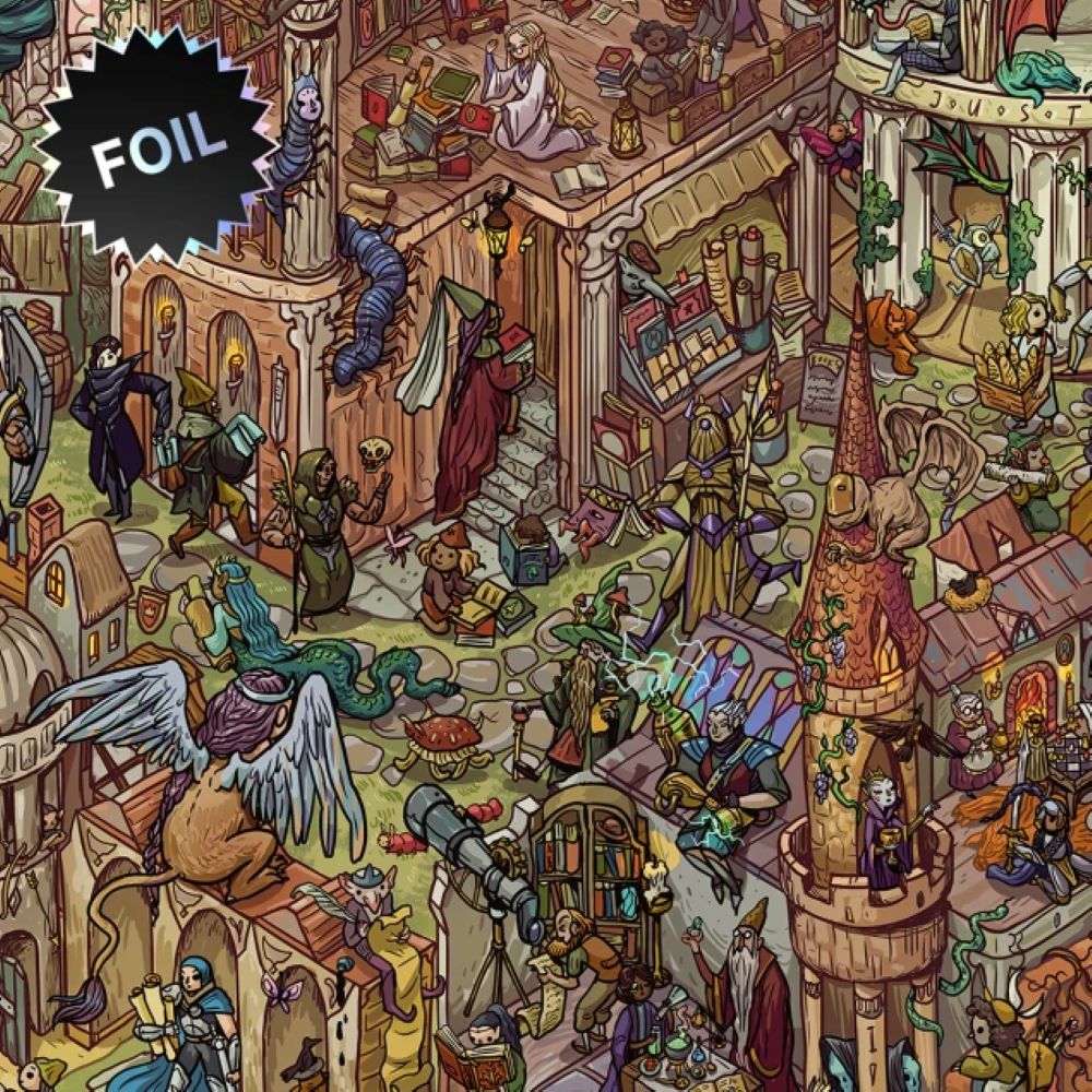 Yes, that’s right. It’s a five-card, Borderless panorama by Marija Tiurina, and it’s jam-packed with hidden Magic and Ravnica references. Please, can you find Fblthp on every card?