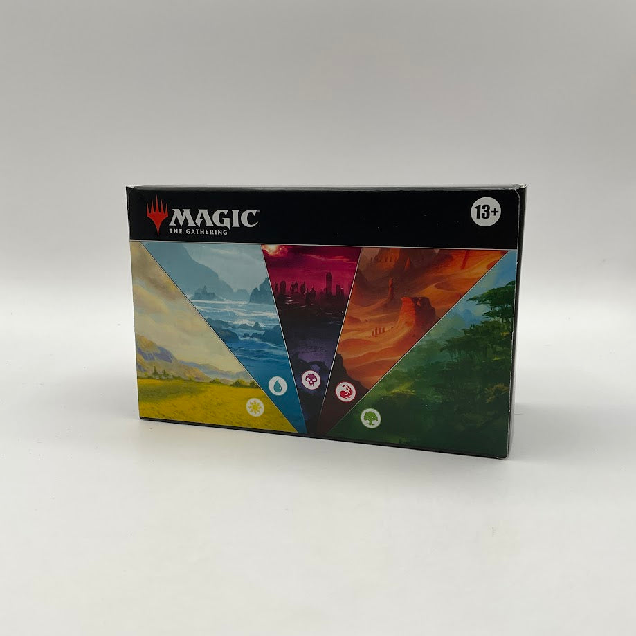 This Land Station contains 400 nonfoil Basic Land cards in a reusable storage box. Each color comes in 3 different card art versions, with all 3 versions included in every box, traveling through the planes of Innistrad, Dominaria, Zendikar, Ixalan, Amonkhet, Theros, Avishkar, and New Phyrexia.