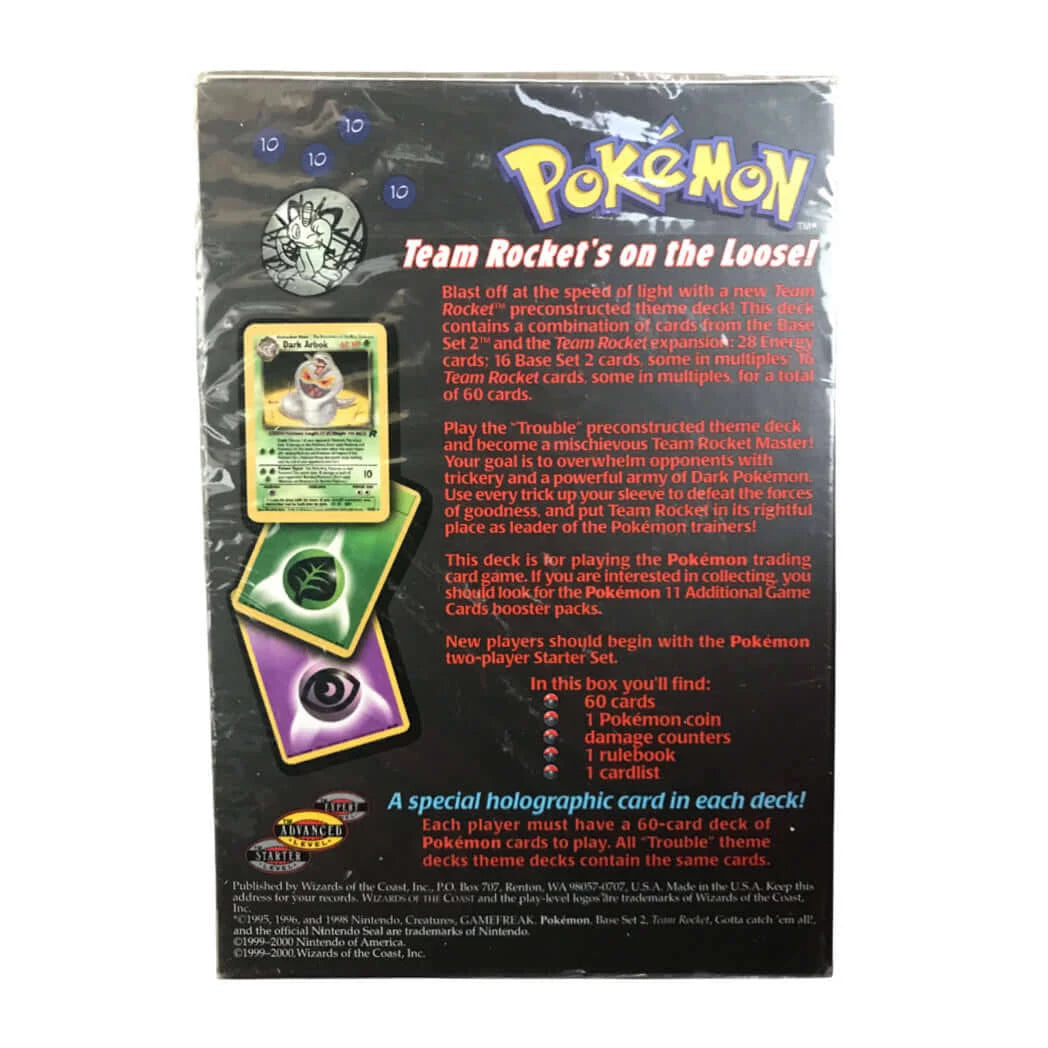 The Trouble Theme Deck from the Team Rocket expansion of the Pokémon Trading Card Game predominantly focuses on Psychic and Grass type Pokémon. Like other Theme Decks, Trouble includes a rulebook, damage counters, a custom coin, and card list.