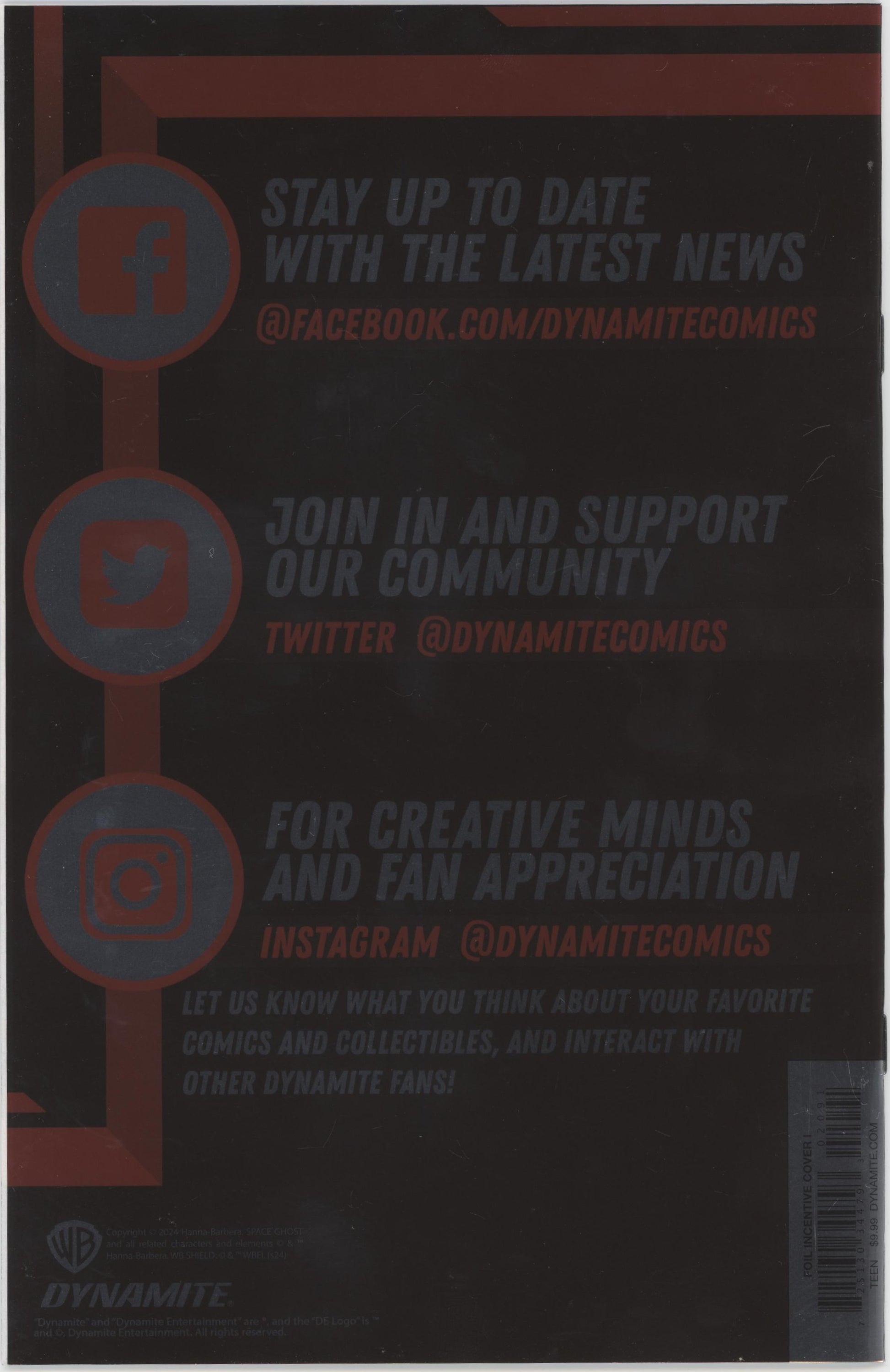 Limited 1 for 10 Retailer Incentive Variant Cover. Written by David Pepose. Art by Jonathan Lau. Cover by June Chung, Jae Lee. ...They call it the Ghost Planet now.' Jan, Jace, Blip and Space Ghost travel to the Ghost Planet, the mysterious headquarters of the even more mysterious Space Ghost. Leaving on an urgent mission, Space Ghost give explicit orders to: STAY. PUT. What could go wrong? Also featuring an unexpected flight of the Phantom Cruiser! Over the next year, everything you know about Space Ghost, his companions and his enemies will be revealed as only Dynamite can! Written by David (Punisher) Pepose and drawn by Dynamite superstar Jonathan Lau, issue #1 features an array of the most incredible artists in the known Galaxy: Bjorn Barends, Francesco Mattina, Jae Lee and Michael Cho! ALL COVERS CARDSTOCK 32 pages, full color. Rated T