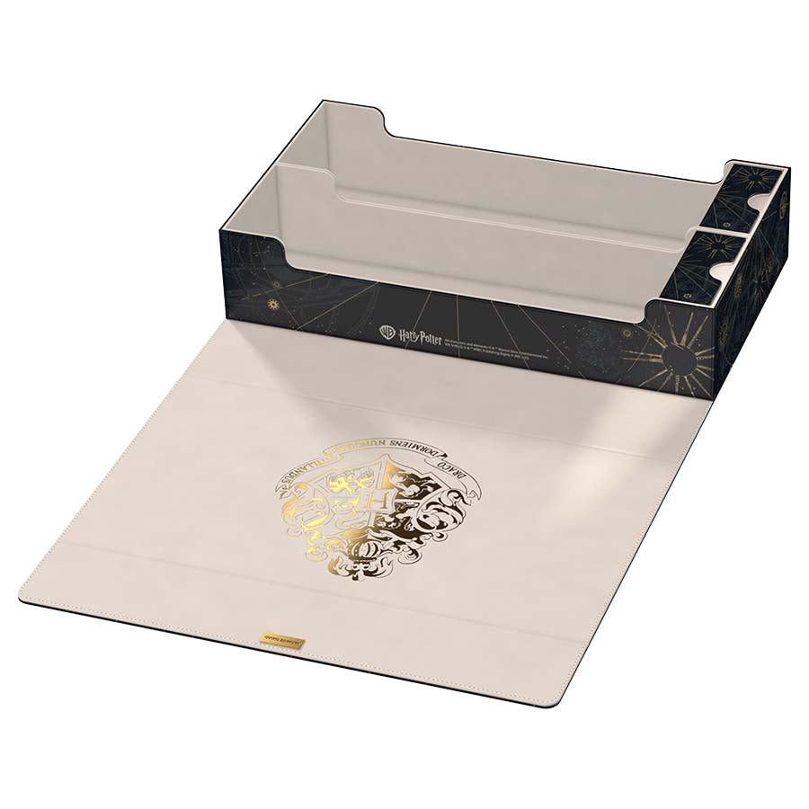 Xenoskin Harry Potter from Ultimate Guard. The bulk storage box made of durable Xenoskin material was designed to store several deck boxes, dice and/or play-mats or alternatively up to 1000 (double-sleeved) or 1250 (single-sleeved) cards at the same time. The Omnihive and the two practical and flexibly positionable magnetic compartments inside have a gentle microfibre interior. The lid is secured with strong magnets and our ZnapClaw mechanism.