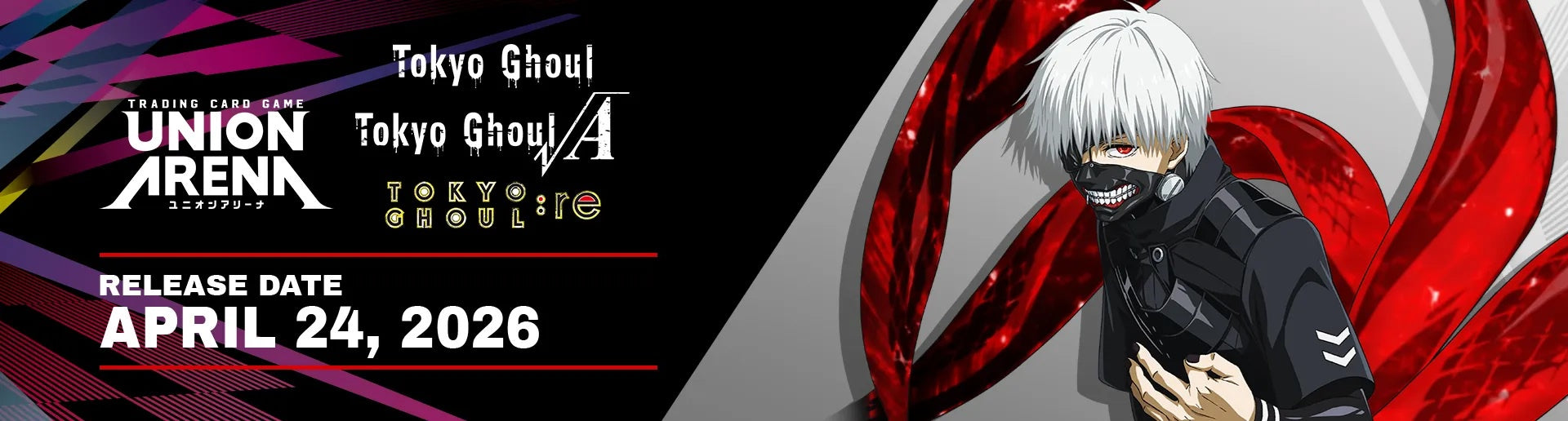 TOKYO GHOUL is joining UNION ARENA! Iconic characters like Kaneki, Touka, Arima, Juzo, and other powerful Ghouls and Investigators are part of this dark and thrilling lineup! All of Tokyo Ghoul, Tokyo Ghoul vA, and Tokyo Ghoul:re are all included! A special card types we're including at low pull-rate is a silver foil SR Ken Kaneki and Haise Sasaki cards that have a serial number printed on them!