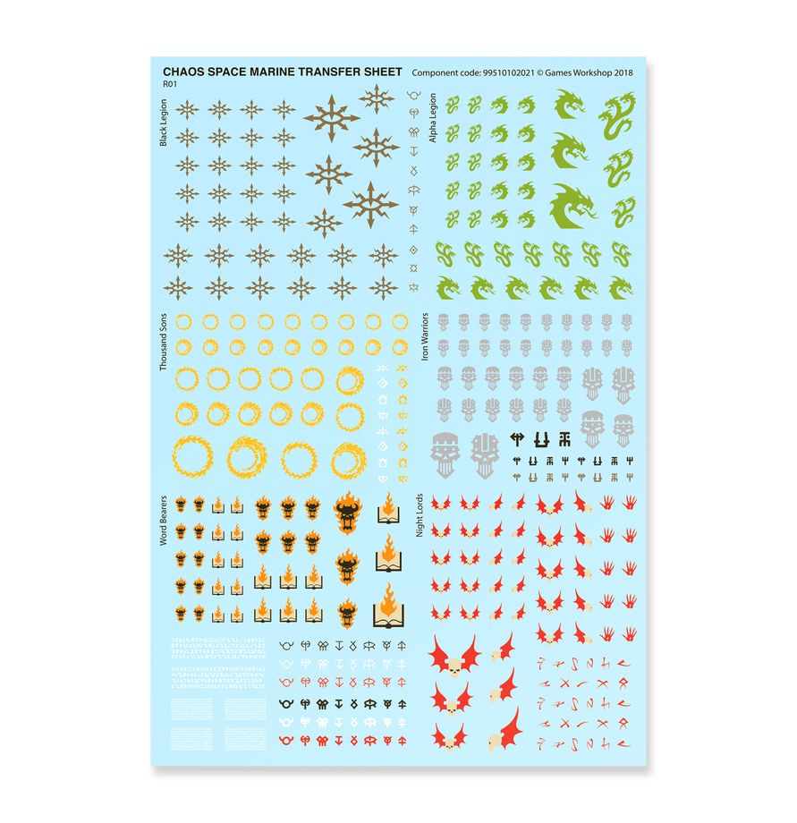 This box also includes 1 Chaos Space Marine Transfer Sheet, featuring 364 high-quality waterslide transfers. These include symbols for the Black Legion, Alpha Legion, Thousand Sons, Iron Warriors, Word Bearers, and Night Lords, along with other cursed sigils for you to decorate your miniatures.